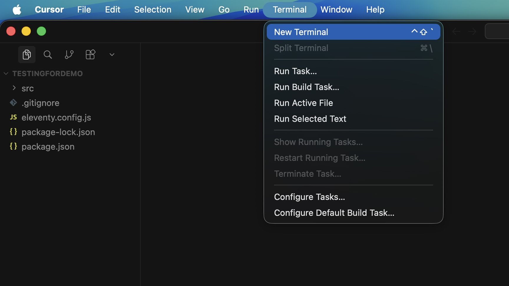 Cursor has a built-in Terminal we can use for this. To open it, look at the top of your screen while Cursor is open. You should see a tab labeled Terminal. Click that, then select New Terminal.