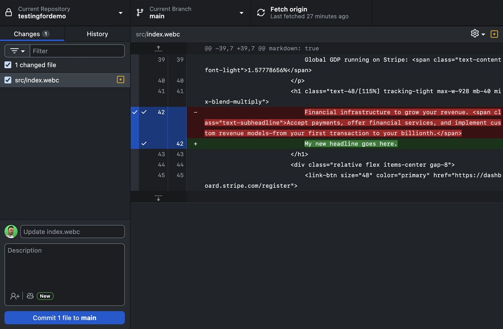 Usually, you'll push changes you make in code to GitHub after completing a more meaningful piece of work. For demonstration purposes, we'll push our simple headline update to GitHub. To do this, we'll hop back over to GitHub Desktop.