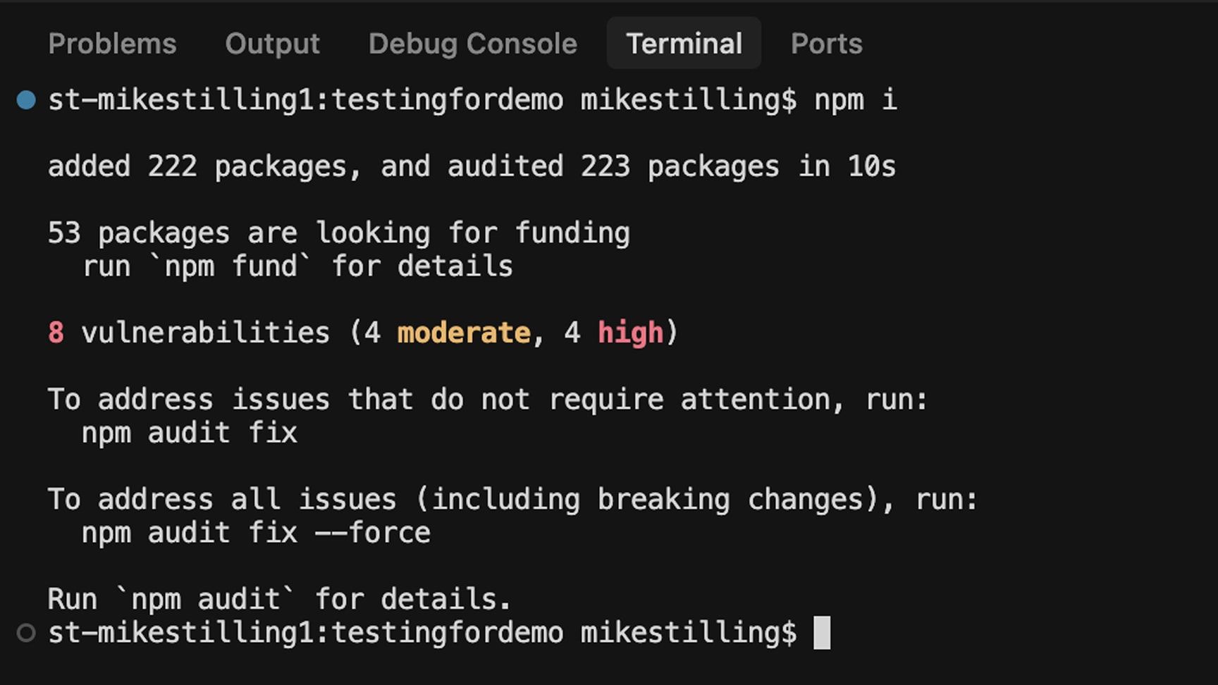 npm iA bunch of things will happen in the Terminal after you run this -- that's totally normal. The vulnerabilities mentioned are fine since we're making a static website, not software that handles users' personal data.