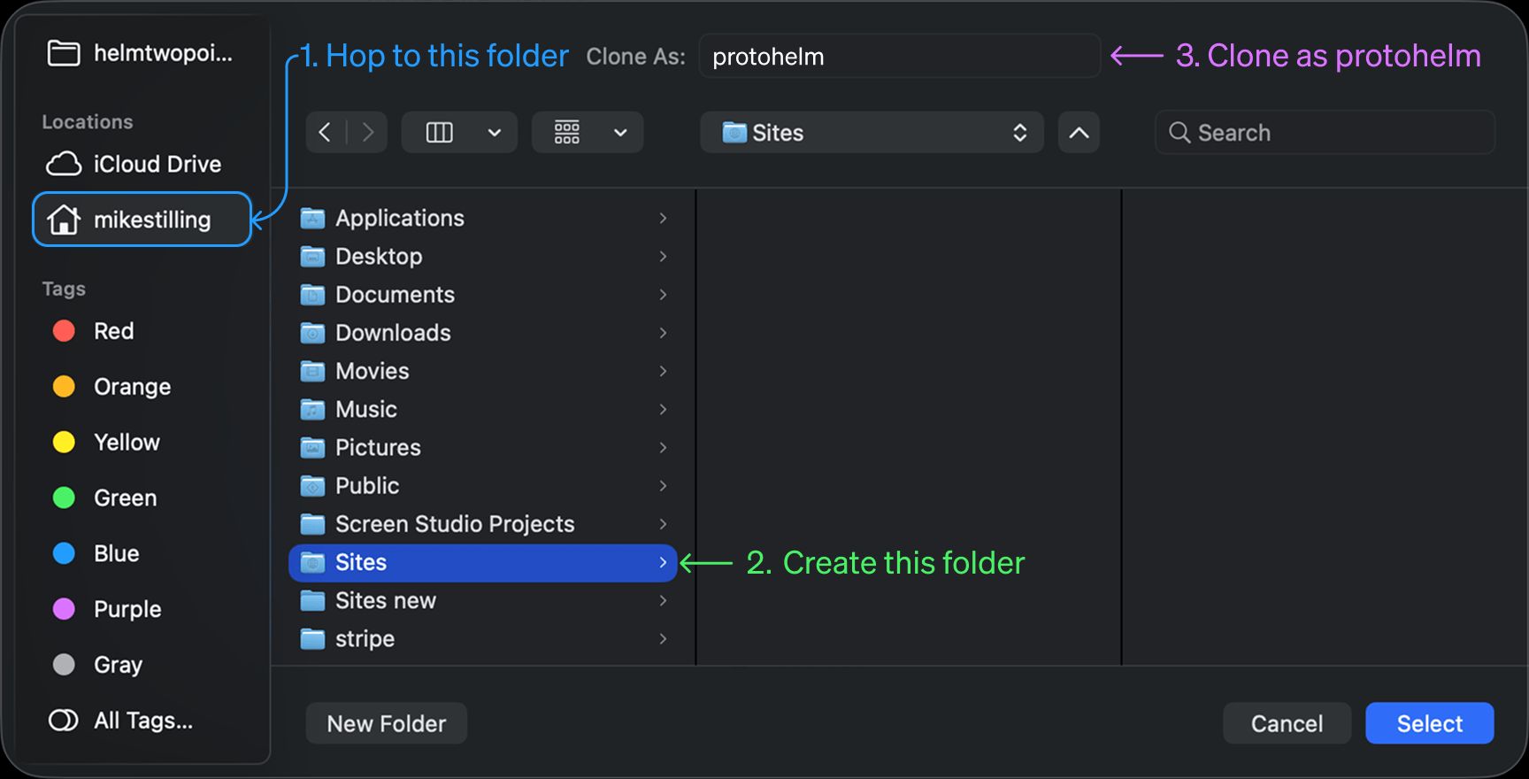 Add button or the Clone Repository... button.Add, select Clone Repository... from the dropdown.protohelm repo.Choose... next to the Local Path field. A Finder window will open.Locations, click your username (e.g. mikestilling).Sites.protohelm in the Clone As: field.Sites folder we just created, then tap Select to close Finder.For reference, here's a visual of the Finder steps: